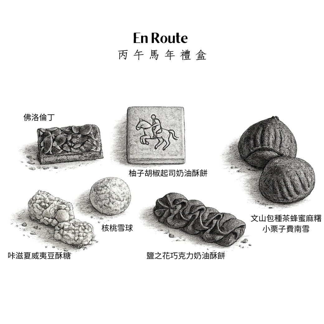 內容介紹 | 鹽之花巧克力奶油酥餅 濃黑可可配海鹽,年節裡的成熟甜香 馬年柚子胡椒起司奶油酥餅 柚香微辣、甜鹹交織,越嚼越香 佛洛倫丁 蜂蜜焦糖杏仁薄脆,金黃酥香迎新年 核桃雪球 核桃烘香裹雪白糖粉,圓滿柔和 文山包種茶蜂蜜麻糬小栗子費南雪 包種茶香清雅,蜂蜜麻糬增添年節柔甜 喀滋夏威夷豆酥糖(米香・白芝麻) 豆香喀滋,米香芝麻滿口喜氣